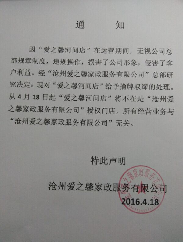 【日常動態(tài)】關(guān)于取締愛之馨河間店的通知